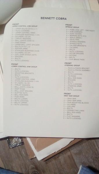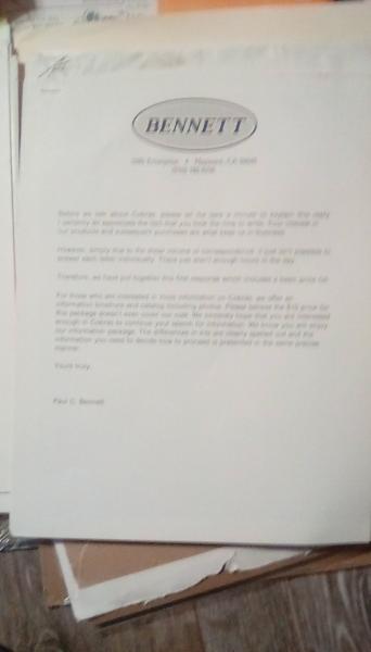 Buzz, I picked up Bennett "package" from person that Paul sold to when he retired. It took two car trailers to haul both 427 Body/chassis and 289 body/chassis, and a 41' enclosed trailer to haul molds for both 427 and 289 bodies, plus 20 or 30 boxes of assorted pieces and parts.Very interesting letter Paul wrote describing his experience/thinking when he designed and built his new chassis. The boxes contained: 5 sets of wind wings, 4 pulk tanks, roll bar and side pipe pieces and parts, hubs, gages up the kazoo, bunch of break fluid tanks, 3 gas caps, 3' x 4' dimensioned drawings, patterns for aluminum, radiators, fiberglass seats, and on and on.