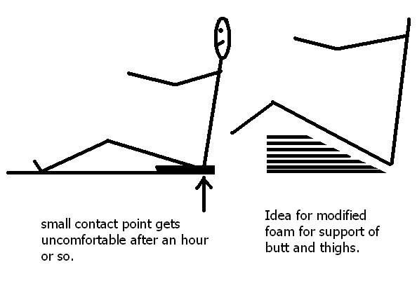 The only issue I have is having only contact on my tail bone does get uncomfortable after a while. I am planning on using layered and staggered foam to get support on a longer section of my seat and that should help a lot. FWIW the blue foam I am using is a cut up aerobics mat....Wallyworld to the rescue again!