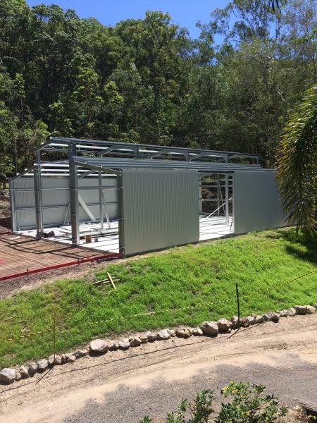 Shed progress pic. In a day they've roofed one side including insulation as well as the up stands in opaque acrylic for allowing in some natural light. Front was being sheeted this morning so by this arvo we should have the other side done and you will note the blue roof colour.