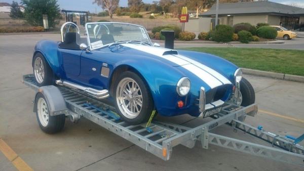 The main features are that it is single axle so can be easily man handled around when unladen, tows very well (we used it to take the Cobra down to the Nationals and back), has a good towing capacity due to the lighter overall weight of the trailer, is made up of heavy duty hot dipped galvanized components which are very well designed, lowers down through the axle for easy drive on/off of low cars, raises up to 900mm above the ground for use as a mobile hoist (my first use was to replace the sump - no floor), the Cobra wheels are secured by ratchet straps through the ladder ramps (just need to think about the location of the ratchets), we also have the spare wheel carrier/wheel, winch and I think they are putting together a front race wheel rack soon. Just tweaking a few small things (eg the mudguards don't need to lose their side steps - just add supporting brackets - hides some of the wiring too), also best to keep the jack compressed or wrapped when not in use to protect the ram from discolouring, it bounces around a bit when towed unladen even with the tyre pressures reduced (as suggested by Raceking) but nothing to worry about. I plan to set up in the shed when not in use on a hitch bolted to the floor/wall or attached to a vehicle and utilize the trailer as a parking spot for the Cobra - keeps both undercover and is ready to use when required. Matt (Raceking Brisbane) sends kits around the country but I think there is also a distributer in WA. Very happy with the trailer, I have attached a photo from the recent Goulburn trip. http://www.clubcobra.com/photopost/data/500/medium/DSC_1290A.jpg[/IMG] |