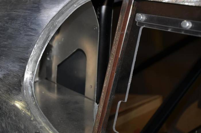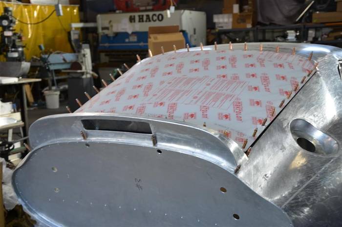Fitting the headlight bucket to the bonnet prior to riveting to the substructure. The copper colored spikes sticking out are Clecos. They are a