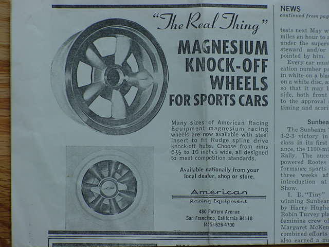 Shelby American Inc. offered “spline drive” magnesium wheels made by American Racing as street and racing options. There were two design types, the original with ‘hidden lugs’ and the revised with ‘exposed lugs’. Both wheel assembly designs incorporated steel adapters bolted in from the rear of the wheel and steel sleeves on the outboard side to be hard wear surfaces for standard AC logo center lock “knock off” nuts. All wheels were for 15” diameter tires.