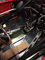 The biggest fiasco happened when we we installing the transmission. I had removed the transmission tunnel and we installed the transmission from inside the car. After we had the transmission lined up for install and supported on the transmission mount crossmember, I crawled underneath the car and left my friend in the car to assist from that point. After several attempts we were able to get the input shaft lined up in the clutch and pilot bearing and had maneuvered the transmission forward enough that I could install a couple of bolts into the bell housing. The whole time I am doing bench presses with that top loader. As the night wore on it became heavier and heavier. As I tried to install the top bolt just above the opening for the clutch fork/hydraulic throwout bearing lines, the bolt slipped in my fingers and fell through the opening into the bell housing