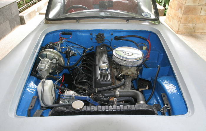 GM Holden Red motor, 202 cid, on a good day, it thumbs its nose at city buses and puts at least 138 ponies to the pavement.