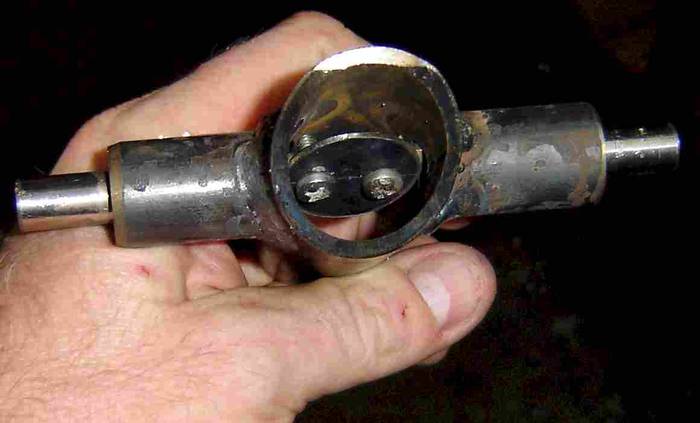 Experimental exhaust valve, steel generally with stainless 1.5mm butterfly plate and screws. To enable diversion of a small amount of exhaust into sidepipes to provide better sound. One each side.