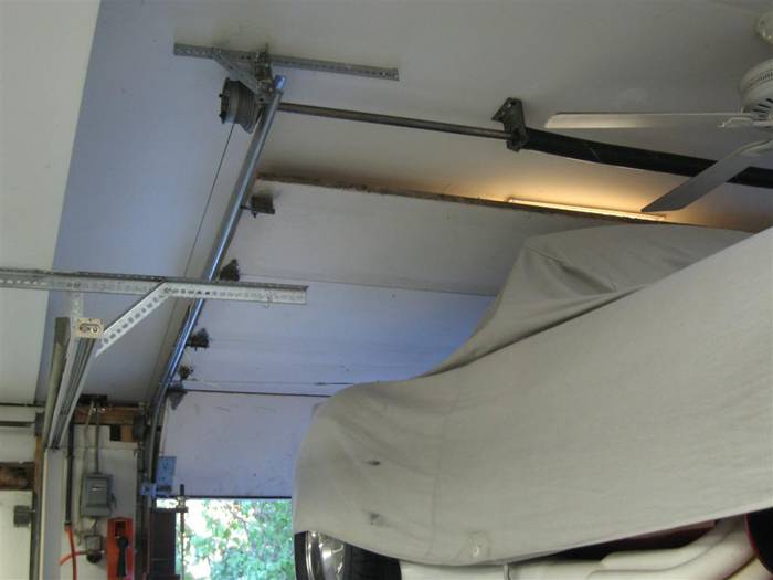 Here you can see the garage door relocated to hug the ceiling so that I can stack cars on my lift. I had a cathedral ceiling finished in one garge bay to accomodate the lift.