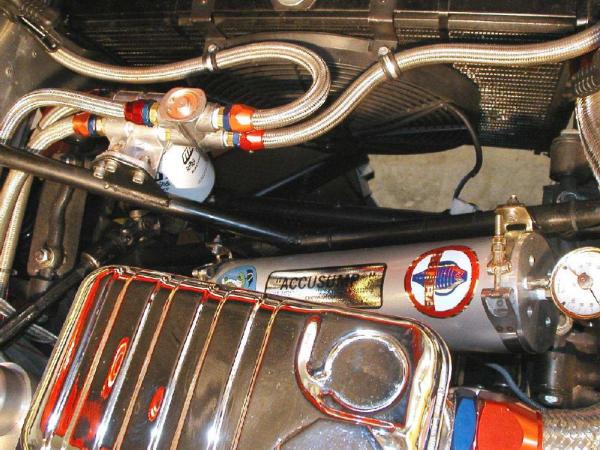 Freshly installed Pegasus oil thermostat for the always too cool oil cooler, shown next to the 3 quart Accusump.