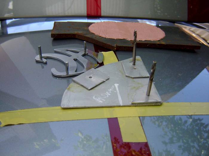 Pic showing the drilling template with 2 holes drilled. In the background is a template I made by putting cling film on the bonnet, and getting the curve into body filler. This mould template was then used to ensure the AC would fit the curve of the bonnet.
