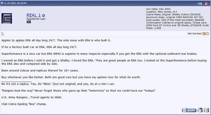 The representations expressed are the representations and opinions of the clubcobra.com forum members and do not necessarily reflect the opinions and viewpoints of the site owners, moderators, Shelby American, any other replica manufacturer, Ford Motor Company. This website has been planned and developed by clubcobra.com and its forum members and should not be construed as being endorsed by Ford Motor Company, or Shelby American or any other manufacturer unless expressly noted by that entity. "Cobra" and the Cobra logo are registered trademarks for Ford Motor Co., Inc. clubcobra.com forum members agree not to post any copyrighted material unless the copyrighted material is owned by you. Although we do not and cannot review the messages posted and are not responsible for the content of any of these messages, we reserve the right to delete any message for any reason whatsoever. You remain solely responsible for the content of your messages, and you agree to indemnify and hold us harmless with respect to any claim based upon transmission of your message(s). Thank you for visiting clubcobra.com. For full policy documentation refer to the following link:
